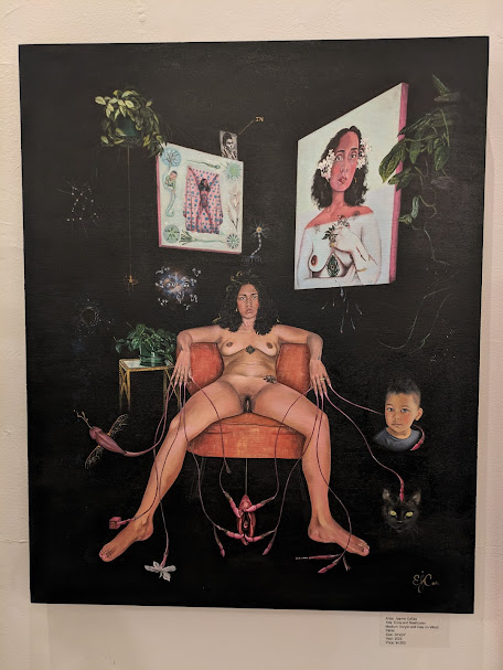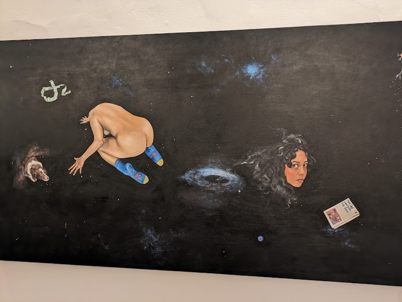 Other notable works are the artist crouched and peeking through what one assumes is a black hole, her body again depicted not as a monolithic object, but what I guess I would describe as a nude Alice in Wonderland, her disembodied head floating near some figures of what perhaps make up her psyche, a very cute Australian Shepard mix lying sadly in the universe on one side, a copy of Philip Guston’s “I Paint What I Want To See” on the other. The next painting, a black void which features the artist splayed nude on an ottoman, surrounded by objects in space that recall fertility, botany, anatomy, and domesticity. Floating nerves, sperm, a gem-like clitoris, a small portrait of Freida Kahlo, an ejaculating phallus with fly wings, houseplants, a cat, a portrait of the artists son, and a smaller version of another portrait in the show, floating around the artist pays homage to Frieda Kahlo’s “Two Freidas” and “What the Water Gave Me”. A beautifully rendered, expressive portrait delights, and a mystical depiction of the artist donning a sheer curtain over her figure intrigues. Also featured are surrealist depictions of the figure in a barren landscape re:Dali , a theme that repeats throughout the exhibit as a monochromatic blue abstraction of the artists body, with disembodied pieces lying scattered throughout the work.