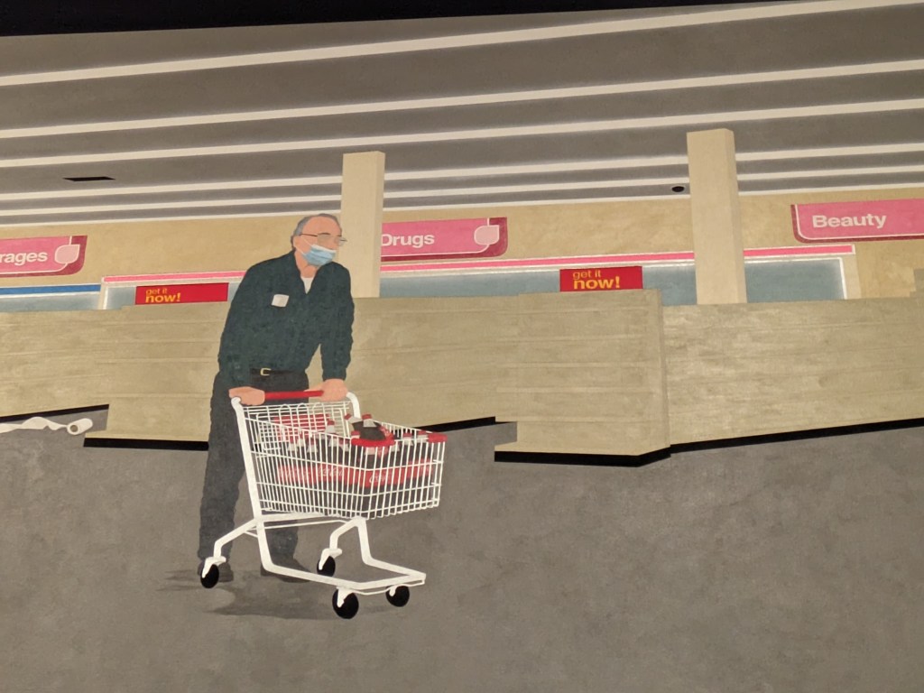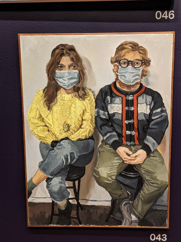 One of the most striking qualities of this exhibit is the uniformity of theme and artistic tribute to works of the past. Many artists seemed to be contemplating similar themes and looking back on the same historic work. Some rooms contained multiple iterations of paintings. American Gothic, in particular, claimed almost an entire wall, with striking variations, including a dramatically lit photograph of a black couple in white-face, a sentimentally rendered oil portrait of a millenial age couple in masks, and a graphioc style acrylic painting of a black couple with afros holding a pic in place of the rake, just to name a few.