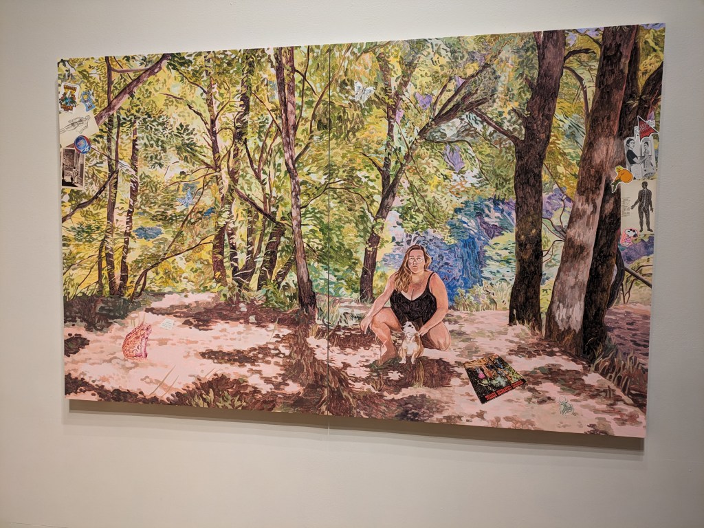 Gina Tuzzi had three works on view, the largest pictured here. This work was a uniquely direct exploration of the self. She gives a deadpan gaze, crouching alone in a dappled riverside clearing, with a small dog standing close by. Light washes of paint impressed upon me the confidence of her hand in applying each stroke, nothing revised, and the economy in the face and body as austere as the expression. Along the sides are her signature pop-cultural adornments, pictures of artists she has studied carefully placed to seem haphazard, like postcards along the borders of a teenage girls mirror, next to surfboard decals and other iconic Santa-cruz counter-culture doo-hickys. This work garners long looks for its summery color pallet, the relaxing quality of the depth of field, and the of-a-certain-time addition of cool stickers.