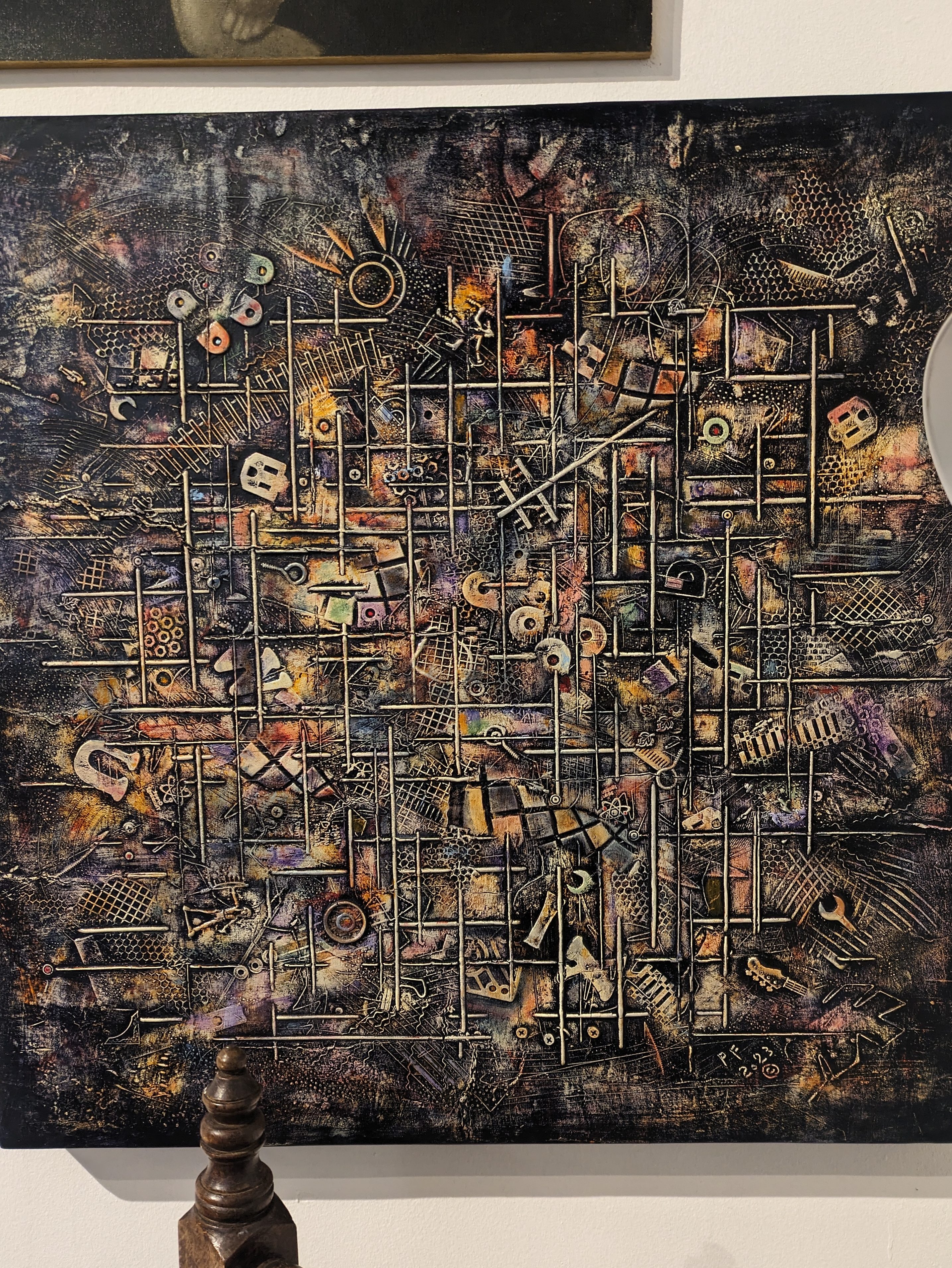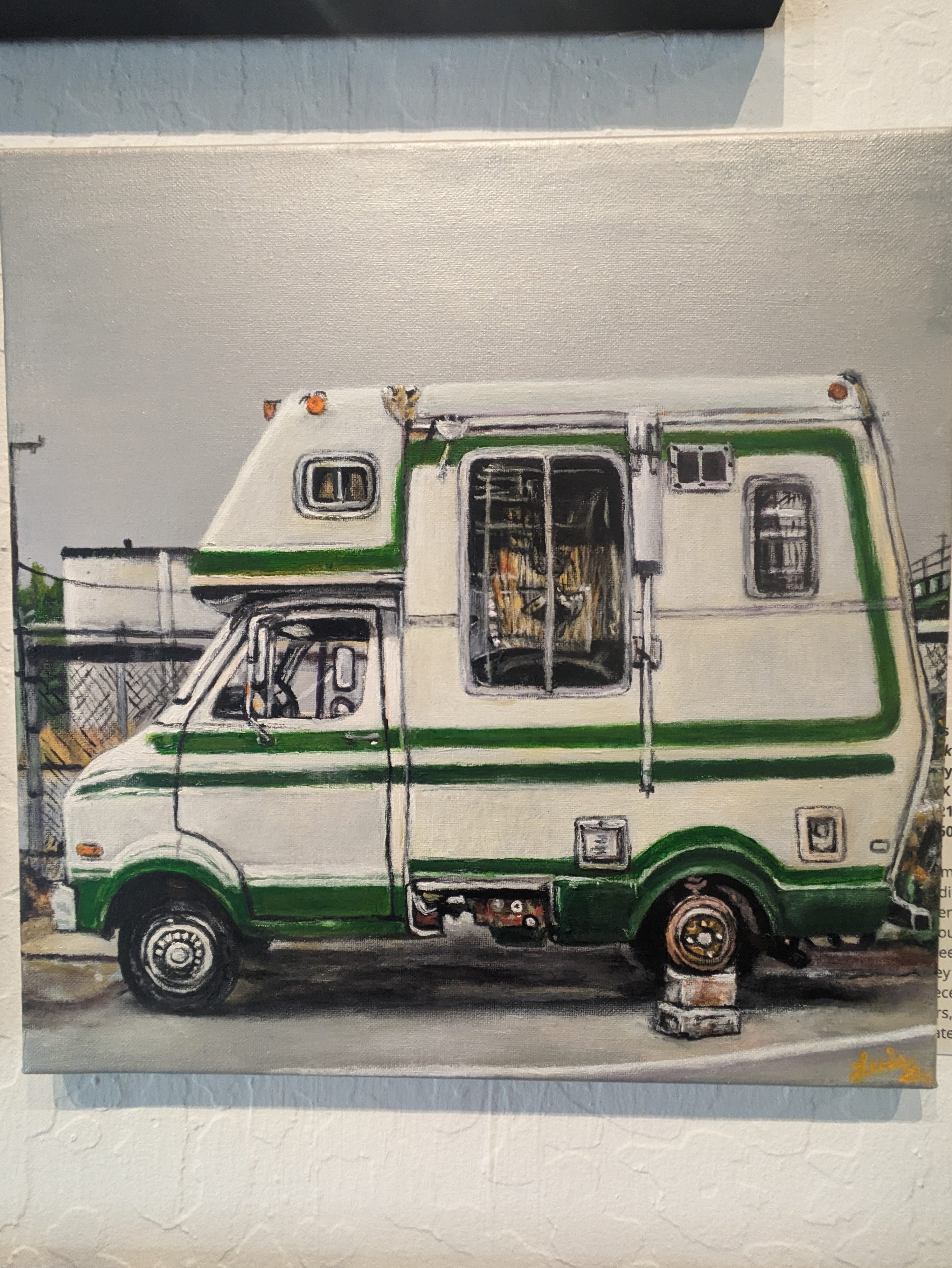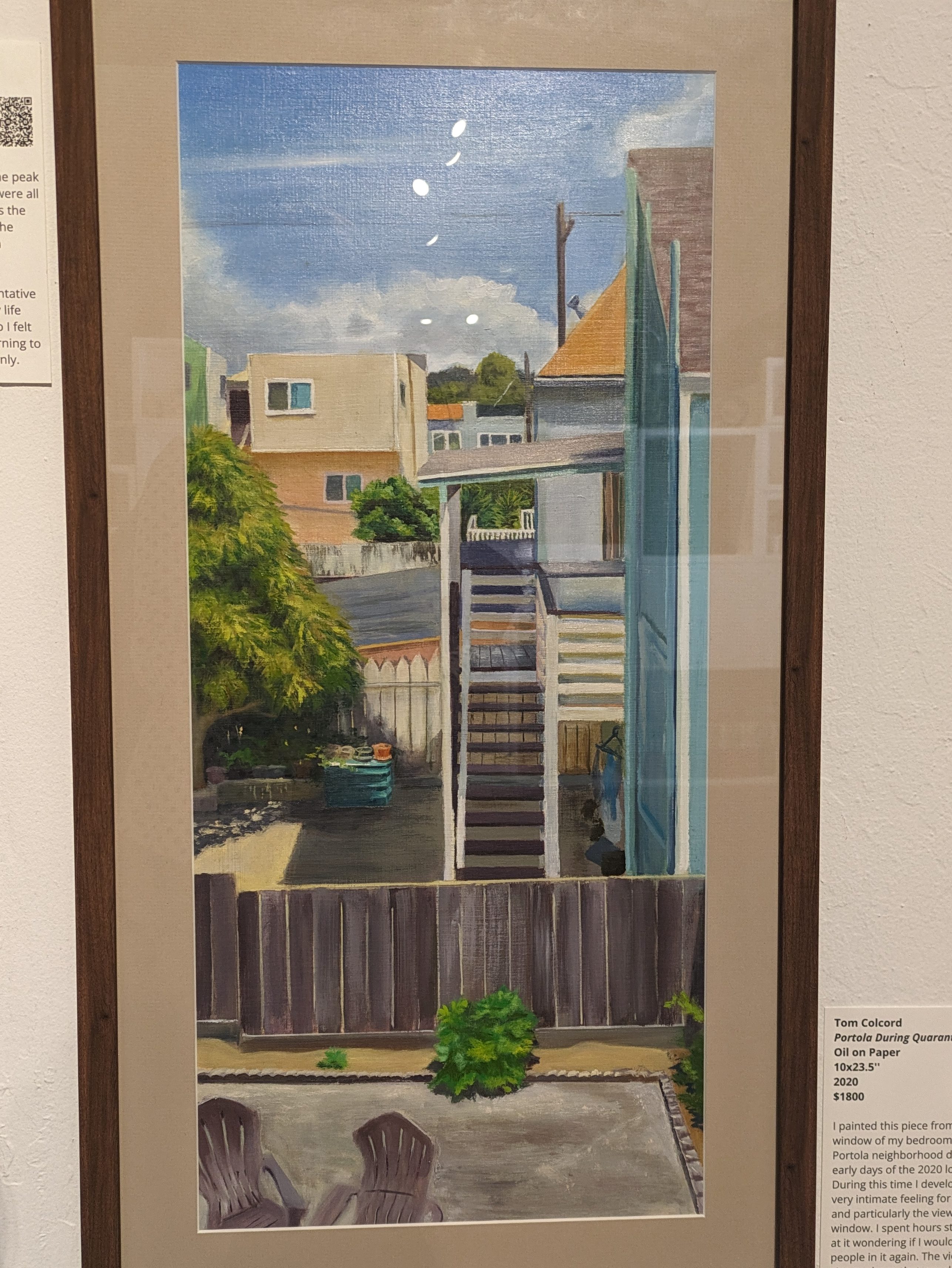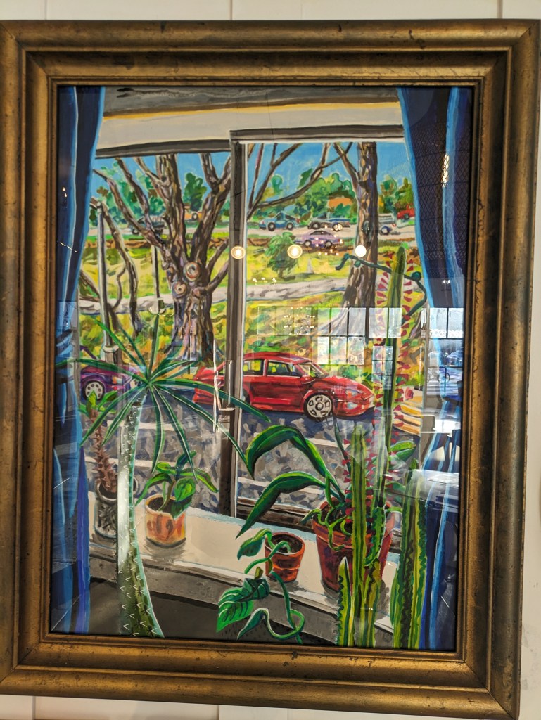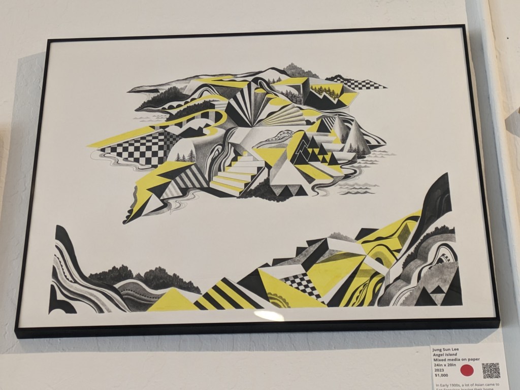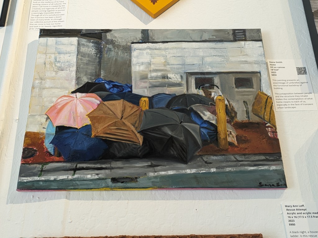 This is a community space. It doesn’t hide being a community space. It is humble, welcoming, and unpretentious. The work is hung salon style as to fit as much relevant work in to each themed show as possible(presumably). Each piece is nicely labelled with a paragraph explaining the artist, their work, or both. There is also a QR code. Type A organization, type B vibe.