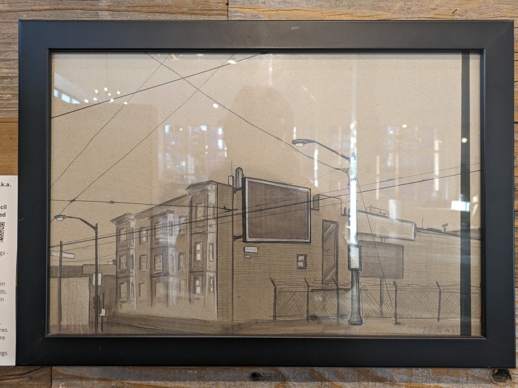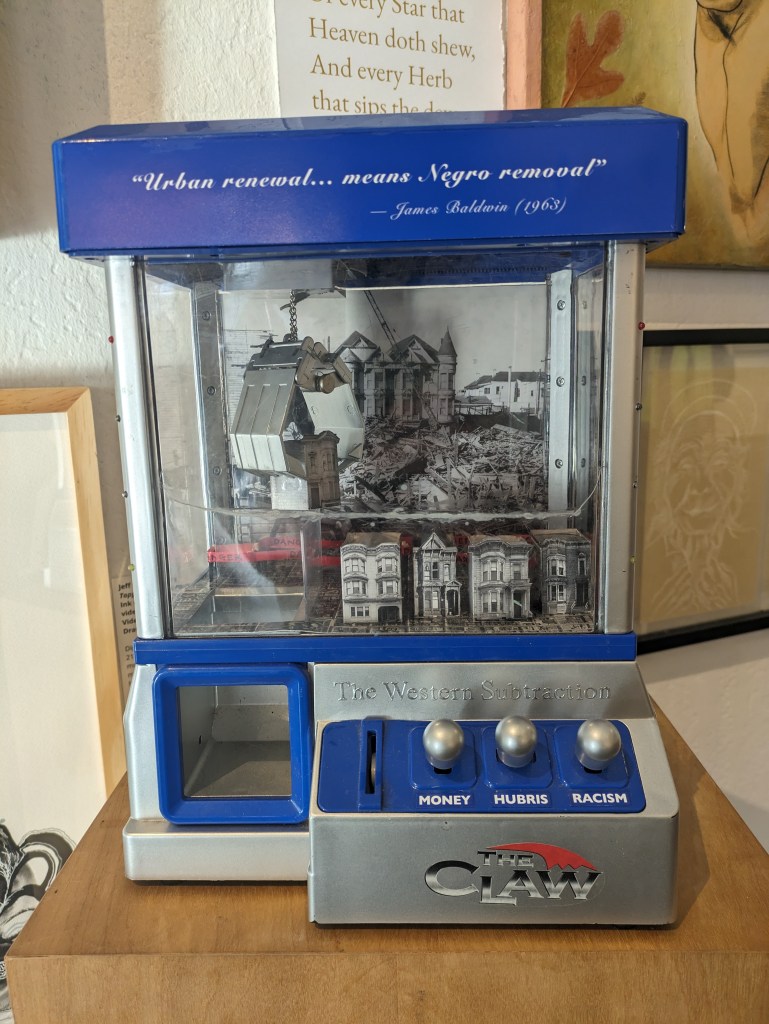 This show was interesting for me as an outsider in some regard, that regard being as perhaps, some might say, a gentrifier; some have said, in fact. I like to shudder myself under an iron umbrella of Public Servant (teacher). I get a lot of small discounts and free coffees this way. But when I talk to old timers, city born and bred types, a gentrifier is a gentrifier, and I have waltzed my way in come hell or high rent, desperate not to return to the conservative art desert from whence I came. The neighborhood I currently live in, the Fillmore, is a historically black neighborhood with a number of famous jazz clubs still in business. To the southeast is the posh Hayes Valley and its small, beautiful park complete with an installation of burning man sculptures. It used to be a place where, my long time city dwelling friends have said, I wouldn’t have been okay to walk at night. Biker bars and garages abounded where there are now French restaurants and expensive boutiques full of designer outdoor gear.