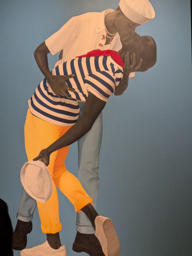 Spanning the five rooms were four large paintings that could have been a full exhibit of their own. The were painted in HD, with backgrounds and narratives that completed the portraits as complete paintings with a message, a composition, and an insistance upon being an ebb in the flow of art history. One of these pieces, a spin on V-J Day in Times Square, depicts two black men holding each other in a deep, intense kiss, their outfits reversed from those worn by the original pair of people in the famous Time Magazine photo (of a sailor planting a deep kiss on a nurse held sway-backed in his arms). The man standing upright wears a crisp white shirt embroidered with roses, with the man held in his arms, under the spell of the kiss, wears a white and navy blue striped shirt with a pair of tight yellow pants, a nautical streetwear outfit. This painting takes two uncommon depictions to task, that of two gay men engaged in a moment of tenderness, and one of two black male Americans replacing two white Americans celebrating an iconic moment as victors in a war story.