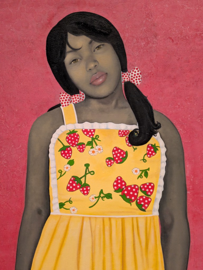 The paintings in this exhibit span from 2005 to the present, with 2005 marking the year Sherald found her distinctive style and technique, around the age of 35. Sherald is known for excelling at executing the subtleties of expression and idiosyncrasies of the face that, at their best, draw breath from the room. Some of her earlier works introduce a whimsical, imaginative quality in the chosen clothes and props that accompany the sitters, infusing her portraits with levity and intellectual curiosity. These compositional choices lie in marked contrast to the uniformly blank, stoic expressions of her sitters. While the backgrounds, clothing, accessories, and even toenails of her subjects burst fourth in vibrant, phosphorescent colors from their tight frames, the faces are uniformly gray and sober. From the beginning of the exhibit to the end, her intent and the results seem to blur together and separate, to focus and unfocus like a concussion, two fingers, no, one, no… By the end, Sherald whips her work into a sometimes surreal, sometimes so-real-you-can-smell-it ouvre of curious, sincere inquiries into the task of depicting blackness. Overall the exhibit is composed of work that explains a story of her becoming, rather than a lifetime of achievement. This isn’t meant to be a perjorative, rather, an interpretation of the works as a story of the artists slow, deliberate liberation through and within painting.