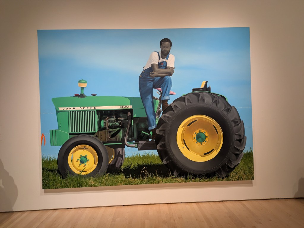 Third was not necessarily art historical, but obviously harkened to black land ownership. It was a painting of a black man staggered atop his brand new John Deere tractor, the tires so freshly minted I could smell the rubber, and each blade of grass beneath him treated with the care of a royal eyelash in a dynastic portrait, placed just so.