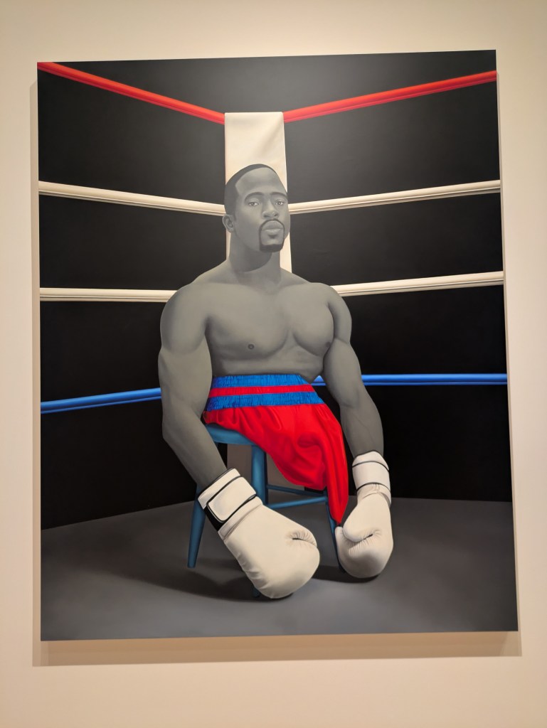 Fourth was also not art historical, but felt placed in a tradition I cant put my finger on, an unsettling portrait of a black boxer wearing Sheralds iconic expressionless face. Because he was an athlete in a position of victory, it fit well here, and the viewer stands beneath him, his eyes cast slightly downward to meet yours. Looking down his body, the boxers shorts end in eery space, with no legs, and his gloved hands, rendered so precisely, hung at the sides of the stool his torso sat upon, the silky folds of his boxing shorts draped haphazardly against the edge. Unsettling is the word I would choose to describe it, and I get this sense that as Sherald paints on, she will lean in this direction more and more.