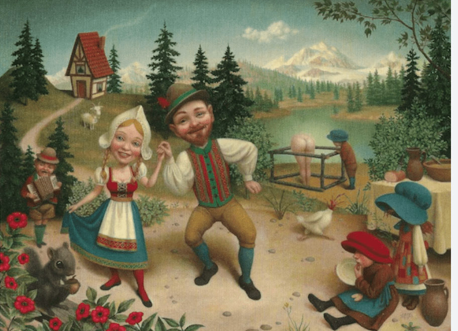 Sherald explains her choice to paint her sitters as grey and stony-faced, saying that she wants to elevate the human presence of her subjects, placing their skin color in a secondary role to their humanity. By giving her sitters neutral, relaxed expressions, Sherald avoids depictions of the black body in a state of performance, she wants to show them being, rather than doing. The colorless skin and affectless expression places the portraits in a historical context of portraiture requisite to color film and footed in long exposure times wherein the sitter couldn’t hold an expression or pose that was unnatural for long enough to get a stable shot. As a result, her portraits appear dated and opaque. The results are mixed. Exploring the first two galleries, I was unnerved that I didn’t quite experience the sublime response that others had described at seeing Sheralds work. At other moments, the paintings evoked the whimsical absurdity of the art/film zeitgeist of the early-mid-aughts, Tim Burton or Burton-ish films like Alice in Wonderland, A Series of Unfortunate Events, and Big Fish, or paintings like those of Marion Peck and Mark Ryden. Distinctly campy.
