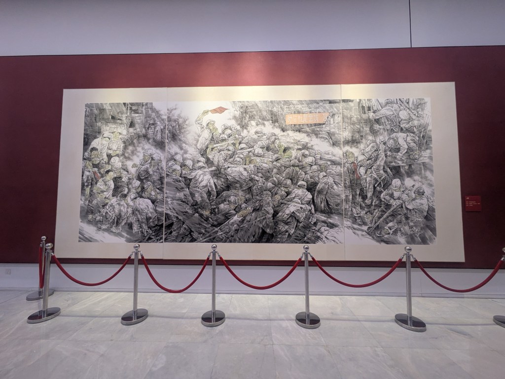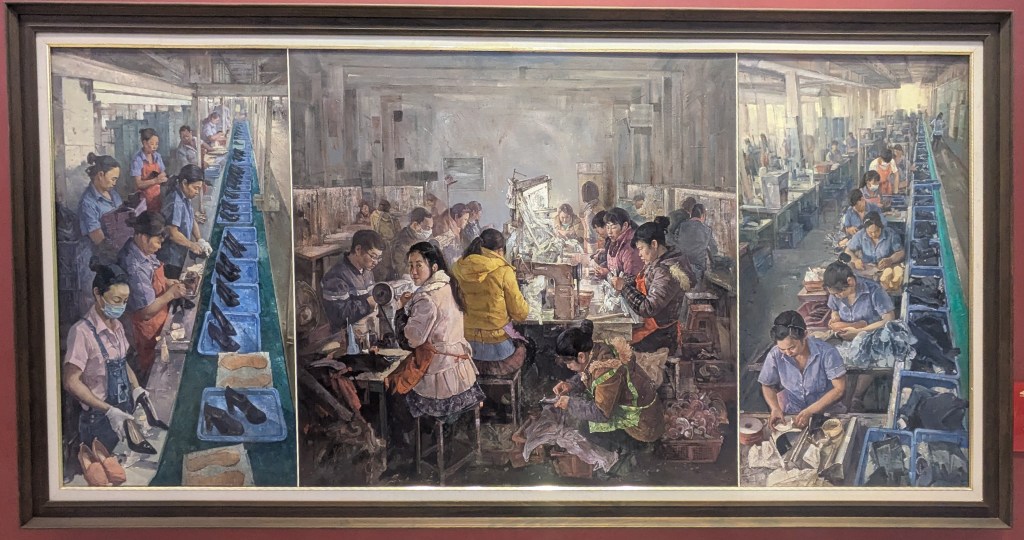 She explained the symbolism behind life sized wax figure dioramas exemplifying the modernization of Shenzhen from traditional Chinese village, to bustling industrial center, with scenes of large outdoor markets selling goods, townspeople riding bikes past public signage that read “Efficiency Is Life”, and interactive miniatures of construction sites for dams where one could re-create a dynamite explosion breaking ground on a dam project. Exiting the exhibition were large paintings and charcoal drawings, the first of which I had seen since entering China. A bloc print featured men scratched out of black ink, wrangling rebar in hard hats. Beyond them a complex, repeating structure grows from the woven rebar, and in the foreground a man shouts into a receiver device, another grapples the wheel of an earth moving vehicle. They are lost to their own individuality in their gargantuan task, their strength a virtue and their focus singular, while the quality of the linework denotes chaos, the half-built structure in the background denotes their ultimate success. In another, a triptych in oil, men and women bend over components of shoes. In the center, bundled up on heavy coats, seamstresses and their male counterparts are illuminated dimly by a doorway with weak sunlight filtering in, the composition dominated with browns, yellows and ochres. A woman glances towards the viewer, hands busy, with an innocent and serene expression. She exudes a contentment with and commitment towards the forward momentum of China and seems resolute in her part in a production line among the others, her equal counterparts in this industrial setting. The other two panels are composed mostly of blues and whites, rows of women at tables alongside a conveyor belt, filled with bine=s of parts cut from different materials comprising different parts of the shoe. The blues of the bins are reflected in their uniforms, denim-colored overalls that contrast beautifully with the morning light coming through from the back of the painting, an opening in the back of the factory floor to the fresh air.
