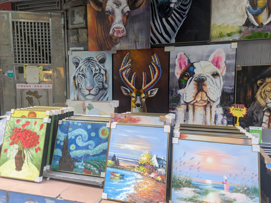 The earthen chakra of my insights centered on a cultural heritage site emblazoned with a museum at its concourse. Known as Dafen painting village, the modes of production here do not parallel the meandering time tables of creativity, the diasporic nature of artists and their workspaces, or the fussy complexities of pricing relative to reputation that plague the artists I know in America. Rather, the place embodies a practical approach to the problem of sales with an unsexy solution – reproductions. Stacks of Starry Night Van Goghs, reams of unframed Muqi persimmons, and some more rare originals by resident reproductionists lined the exposed brick alleys. The artists who work here also live here, and the government provides subsidies for these artists’ housing. Hearing this, I thought back to the innumerable city hall meeti ngs, petitions with stock prewritten letters, artists zoom think tanks, and tragic evictions I had been privy to pertaining to this issue. Here I was, in a country I had been endlessly warned about for its ‘living conditions’, observing its subsidized artist housing- something I had always regarded as a lofty and idealistic dream. Weaving between round-faced street cats and hot broth carts accepting electronic yuan, I smoked Chunghwa cigarettes and thought about how odd it was that the pictures so highly valued in European art were being reproduced for economic benefit here in this village, while art was subject stringent protocols of censorship in the art world, China edition.