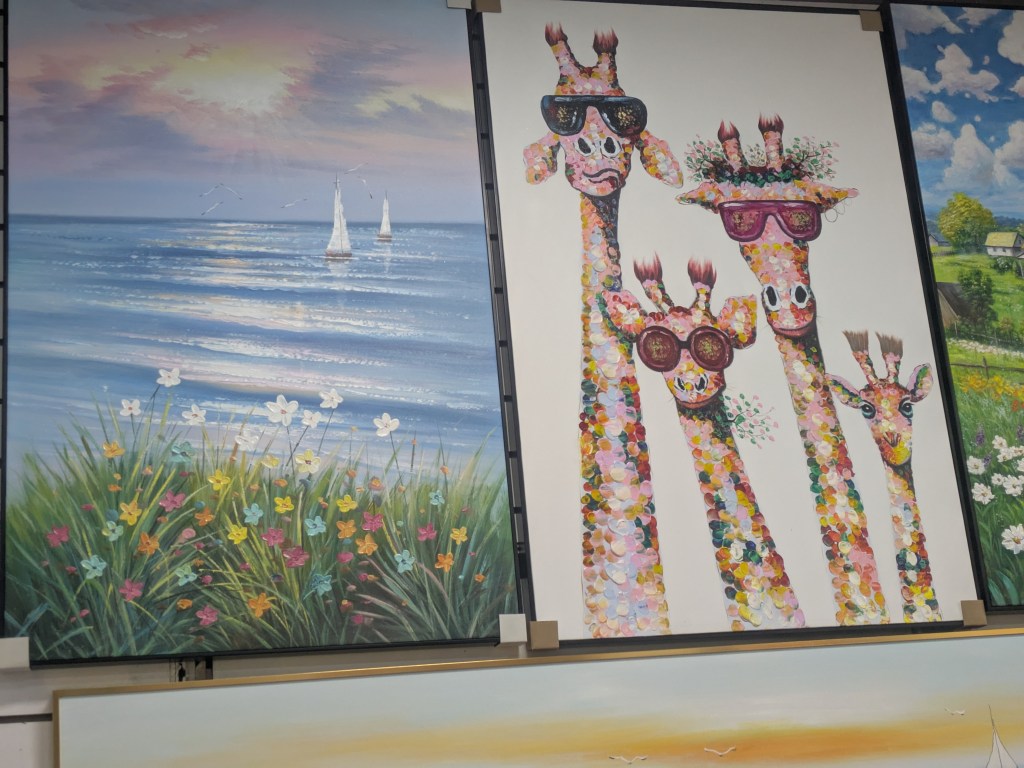 In the behemoth ‘special economic zone’ of Guangdong Province that is Shenzhen, much of the city ascribes dogmatically to economic incentives deemed necessary for China’s survival post 1980. The Dafen Oil Painting village is a historical area, preserved to retain its characteristics pre-1980 industrial revolution. However, Dafen, like the rest of Shenzhen, had to adapt. Existing as a tourist attraction, a marketplace, and a cultural hub all at once, Dafen somehow feels effortless. Artists sit in their studios that double as ‘galleries’ quietly layering paint upon canvas surrounded by stacks of reproductions. Outside, smokers mirror iconic little girls in stacks of Yoshitomo Maras. Inside, artists scrape, layer and dab commissions dutifully, with tourists holding pet turtles and squirmy children enter through the doors of their studios to gaze at the works in progress at their leisure. In the way of much of Asia, it is a carousel of people working, commuting, enjoying, and just living, with glimpses here and there of the juiciest little oddities.